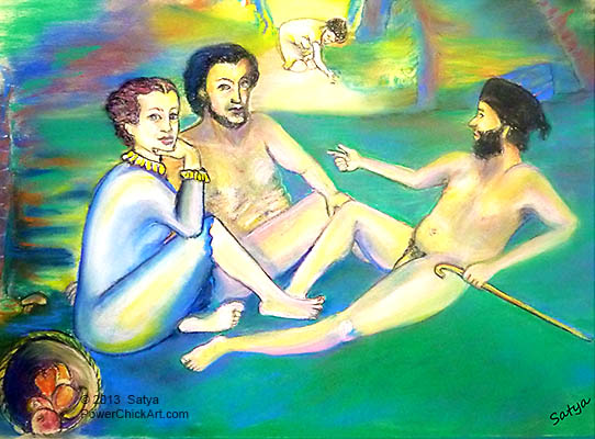 Art has played a prominent role in society and influences how we should think. Edouard Manet’s “The Picnic” was the inspiration for me to paint “It’s Been No Picnic”. In Manet’s 1863 oil painting, the women are undressed, and the men clothed, which now seems the norm. Trained as a psychodramatist, I have learned to find much value in role reversals.